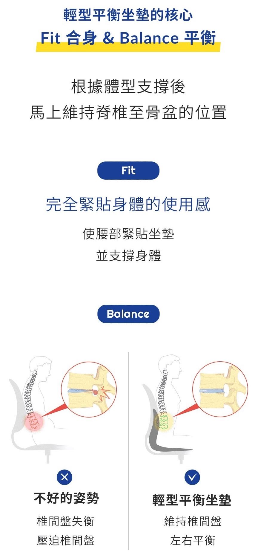 ※緊貼感:坐墊緊貼腰部及背部,穩定從脊椎到骨盆的部份